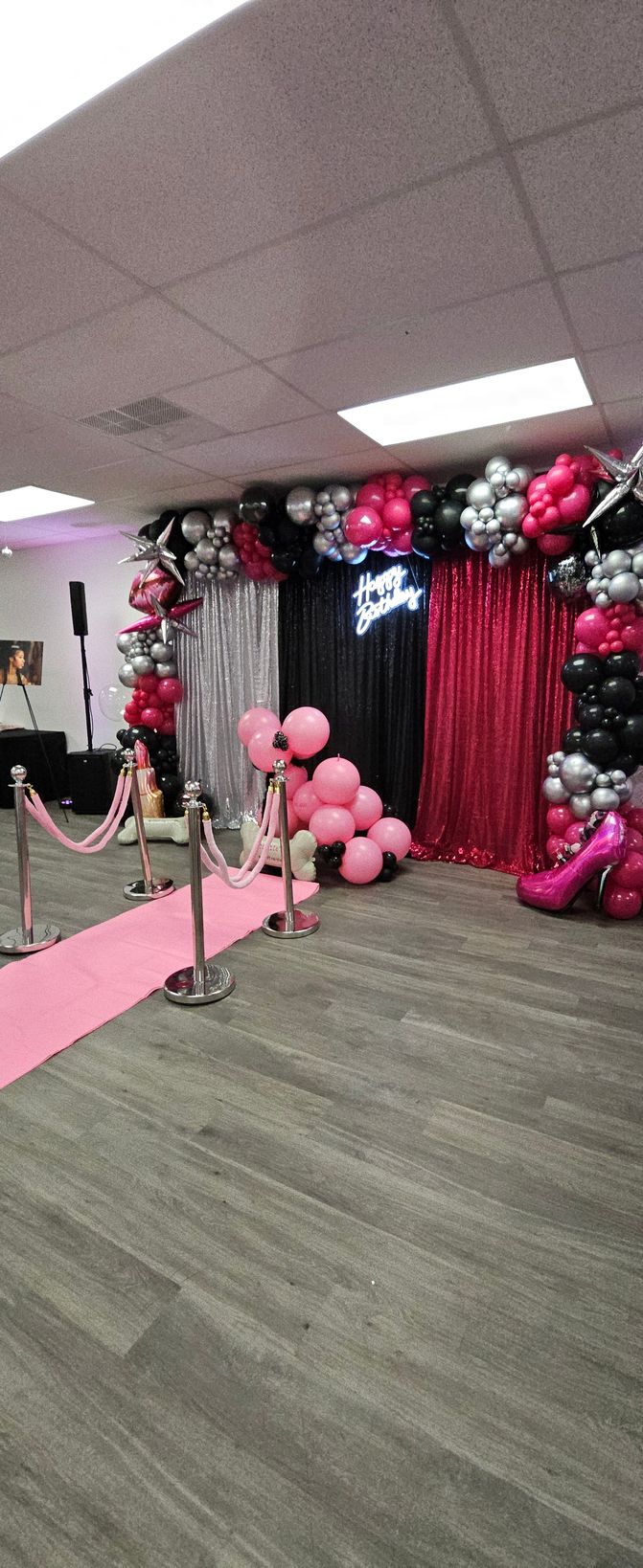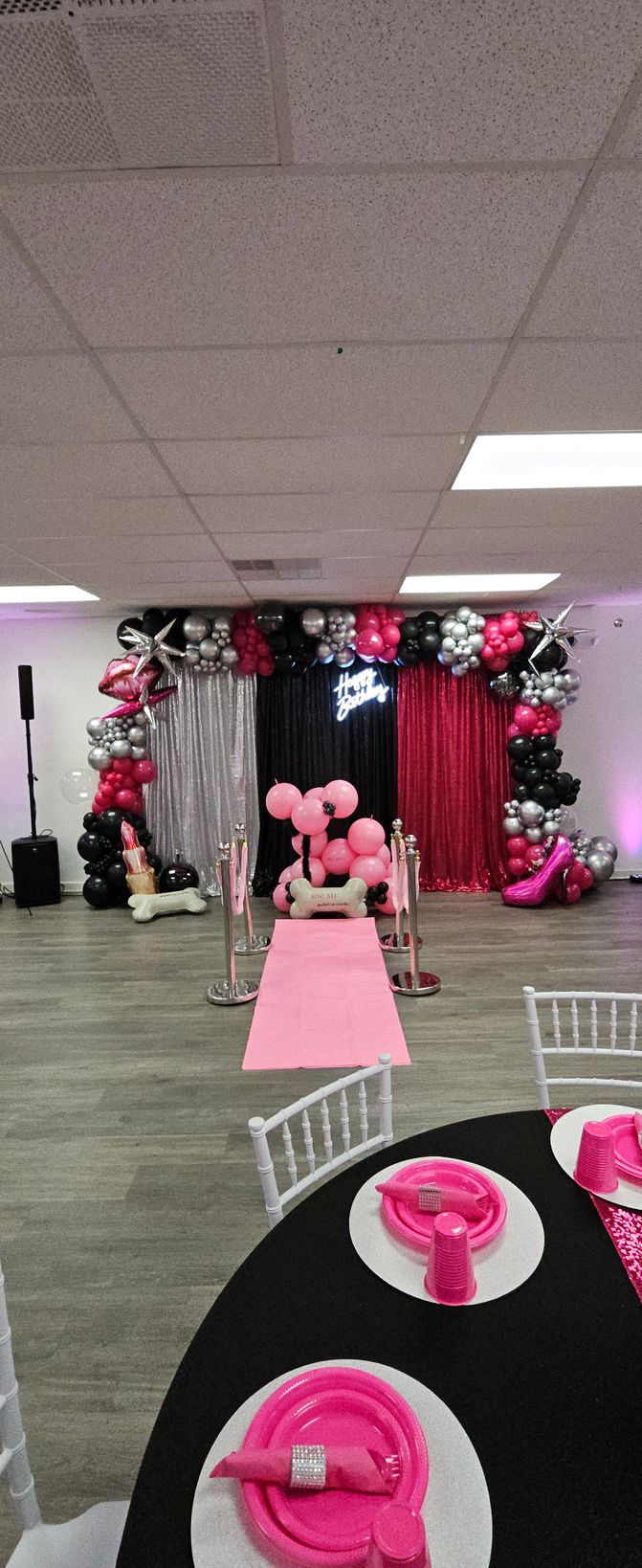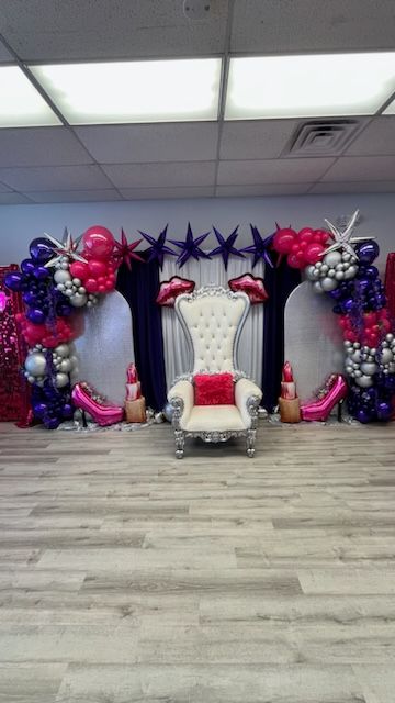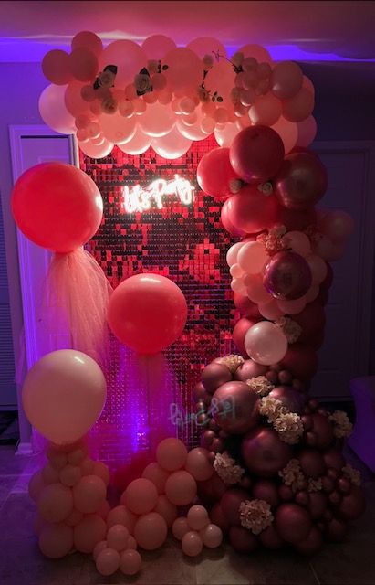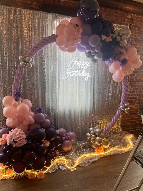 Create a picture-perfect celebration with this stunning birthday party balloon arch! Featuring a wrapped circular frame adorned with shades of pink, lavender, purple, and metallic silver balloons, accented with delicate florals and a glowing ‘Happy Birthday’ neon sign. Ideal for milestone birthdays, sweet sixteens, adult birthday parties, and luxury celebrations. Designed by My Life In Balloons LLC, providing high-end balloon decor throughout South Jersey, Philadelphia, and Atlantic City."