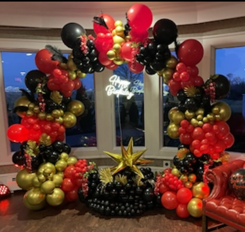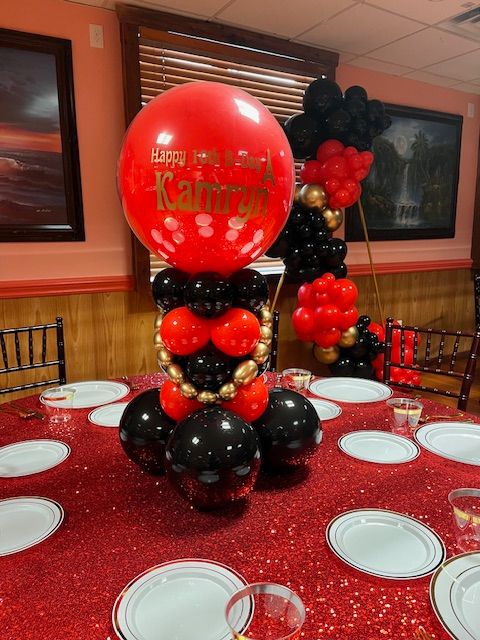"Birthday Balloon Centerpiece | Red, Black, and Gold Custom Party Decor"