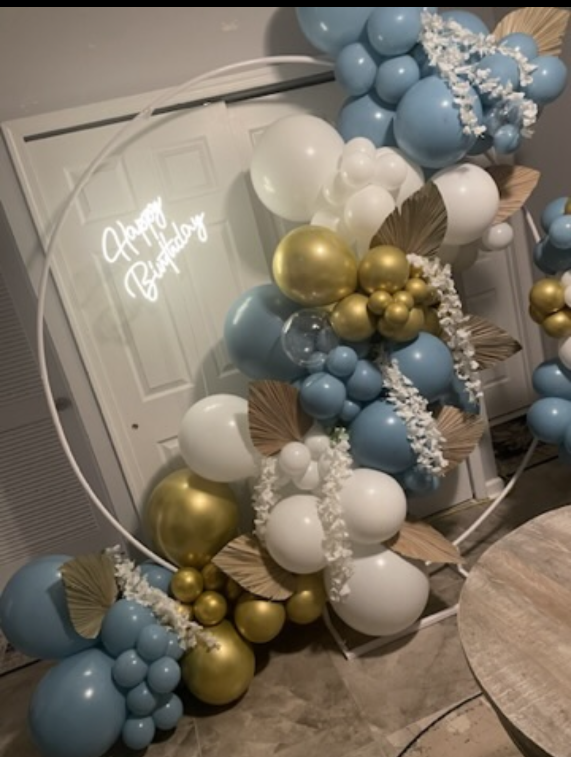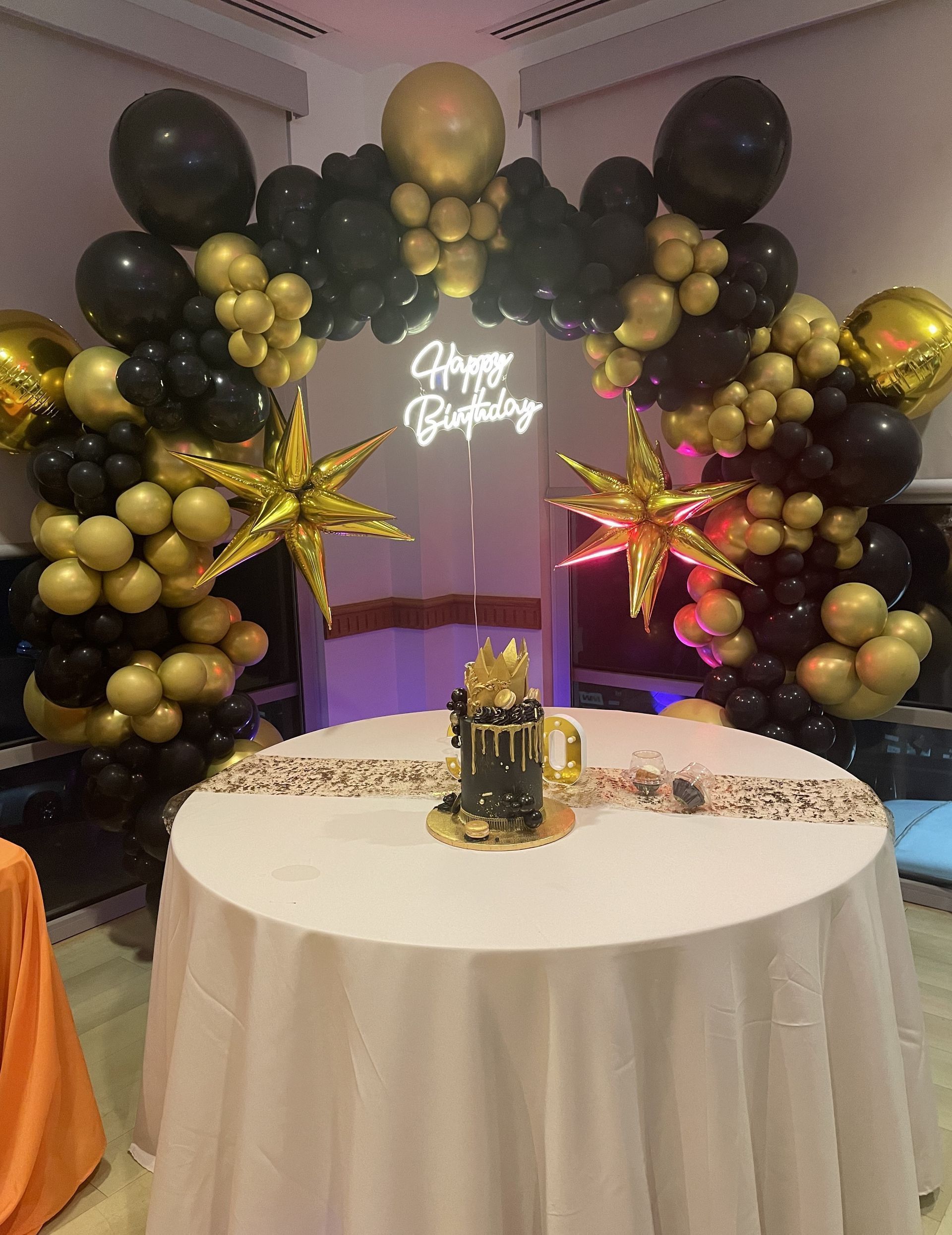 Created to elevate a milestone celebration, this organic black and gold balloon garland featured luxe metallic tones, floral accents, and golden leaf embellishments. Set against a soft drape and lit with a glowing “Happy Birthday” neon sign, this piece was designed to make the guest of honor feel like royalty.