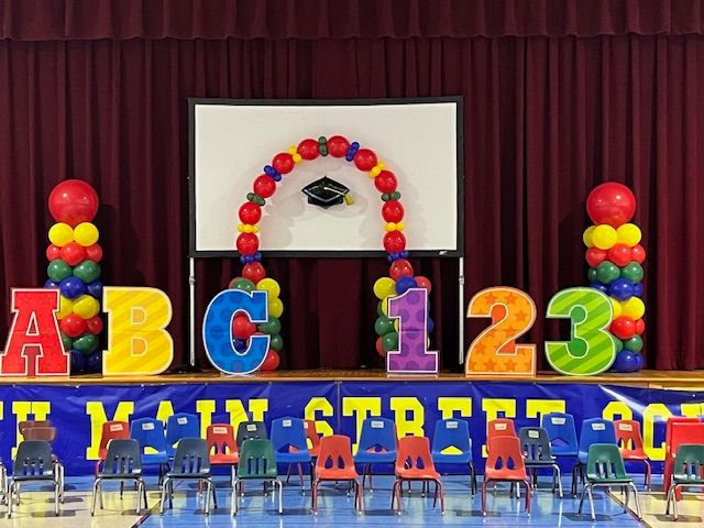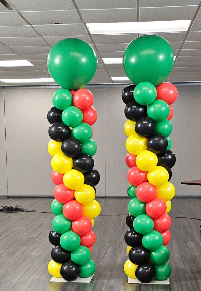 These vibrant red, yellow, green, and black balloon columns were designed by My Life In Balloons LLC for a Pan-African or Black History Month celebration. Featuring bold spiral patterns and large topper balloons with whimsical swirls, these decor pieces brought pride and cultural vibrancy to the classroom setting.