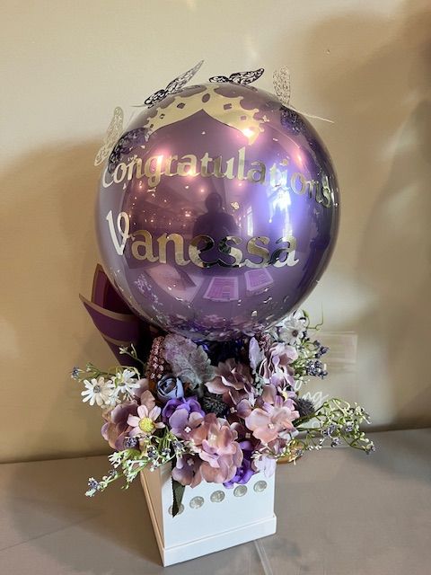 This elegant black and gold balloon bouquet was created to celebrate Stacie’s 50th birthday in style. With personalized vinyl lettering, a luxe floral base, and high-shine finish, it made a stunning statement piece and a thoughtful, custom gift.