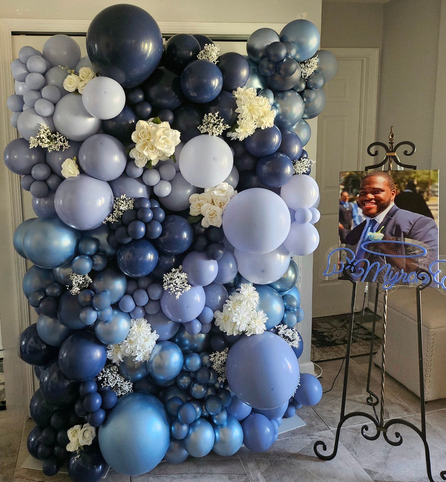 Celebrate graduates in style with this luxurious blue, white, and gold organic balloon circle arch by My Life In Balloons LLC. Perfect for outdoor backyard graduations or photo ops, this setup features a custom “Congrats Grad” sign, faux floral accents, and a flowing draped backdrop. A show-stopping piece for any graduation celebration in South Jersey, Philadelphia, or surrounding areas.