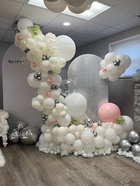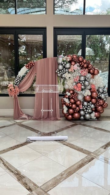 Elevate your special day with this luxurious wedding balloon arch featuring a stunning blend of rose gold, silver, and white balloons. Beautifully paired with soft blush draping and delicate floral accents, this organic balloon design creates a romantic and sophisticated backdrop for ceremonies, receptions, and bridal showers. Perfect for modern, classic, and luxury wedding themes. Designed by My Life In Balloons LLC, proudly serving South Jersey, Philadelphia, and Atlantic City with breathtaking balloon installations for unforgettable moments."