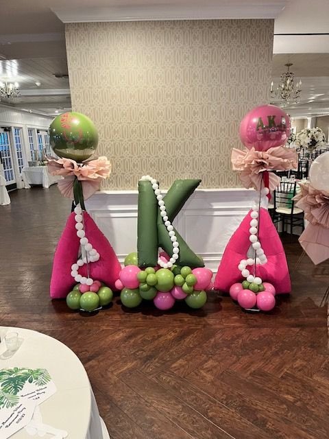 Celebrate in signature Alpha Kappa Alpha style with this stunning pink and green balloon display featuring custom marquee letters. Designed by My Life In Balloons, this decor includes a bold "K" balloon letter centerpiece, vibrant balloon bases, elegant pearl balloon strands, and two branded orbz balloons. Perfect for AKA founders’ day, chapter events, birthdays, retirement parties, or Greek life celebrations. This setup adds charm, color, and elegance to any venue and makes a picture-perfect photo backdrop for sorority sisters and guests alike.