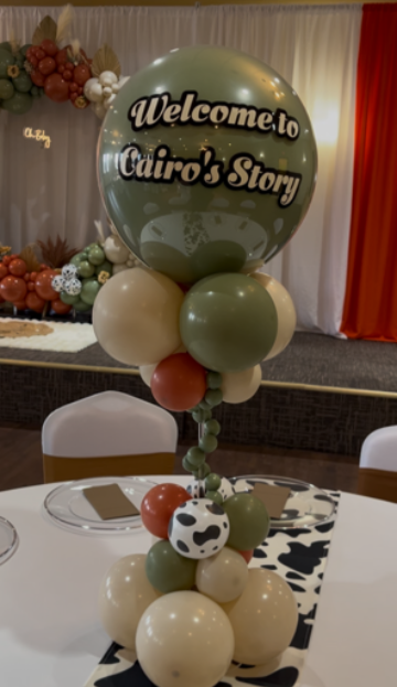 Celebrate a baby boy in style with this rustic, farm-inspired balloon decor created by My Life In Balloons LLC. This custom setup includes a show-stopping organic balloon arch, a personalized table centerpiece featuring a cowprint balloon, a charming half-circle balloon arch with earthy tones, and a coordinating welcome sign balloon garland. Perfectly blending sage, ivory, terracotta, and cowprint accents, this baby shower setup brings warmth, charm, and storytelling to life. Designed for themed baby showers and unforgettable moments in South Jersey, Philadelphia, and surrounding areas.