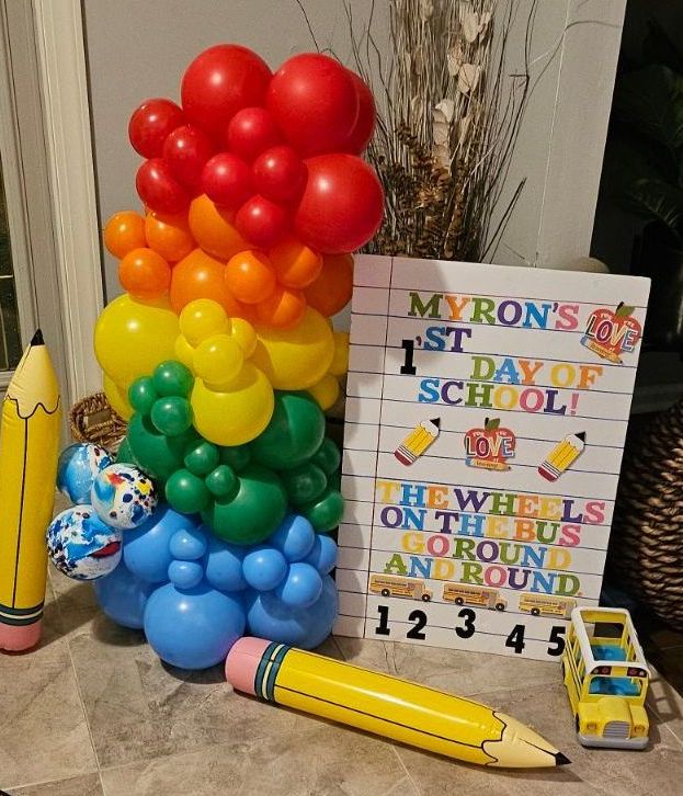 These vibrant red, yellow, green, and black balloon columns were designed by My Life In Balloons LLC for a Pan-African or Black History Month celebration. Featuring bold spiral patterns and large topper balloons with whimsical swirls, these decor pieces brought pride and cultural vibrancy to the classroom setting.